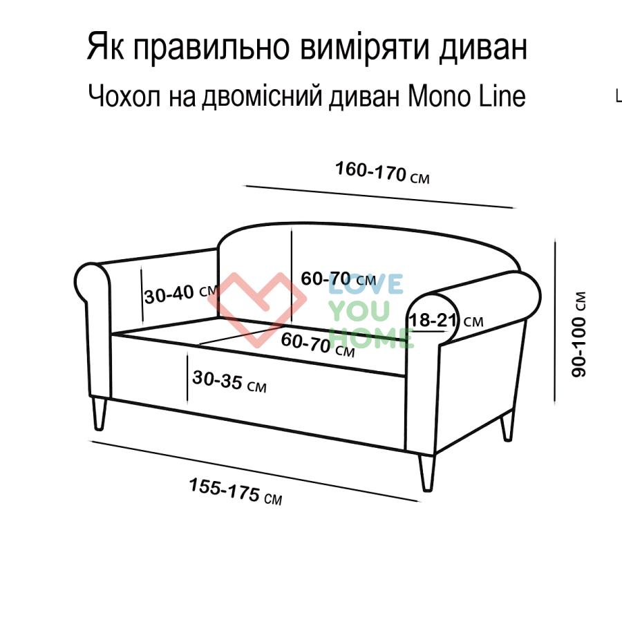 Еластичний трикотажний чохол із жакардовою текстурою для диванів Чохол виготовлений з якісного трикотажного матеріалу з жакардовою текстурою, яка надає інтер'єру сучасності та витонченості. Завдяки спеціальним виточкам і комплекту з поролоновими валиками, чохол забезпечує ідеальне прилягання до меблів, повторюючи форму сидіння, спинки і підлокітників. Основні характеристики: Матеріал: Високоякісний стрейчевий трикотаж із жакардовою текстурою, який поєднує еластичність і міцність. Дизайн: Однотонний і сучасний, гармонійно впишеться в будь-який інтер'єр. Комплектація: У набір входять поролонові валики для надійної фіксації тканини між сидінням, спинкою і підлокітниками. Функціональність: Ефективно захищає меблі від пилу, плям, пошкоджень і зносу. Переваги: Легке встановлення: Завдяки еластичній тканині та поролоновим валикам чохол легко натягується і надійно фіксується. Охайний вигляд: Ідеально прилягає до форми дивана, запобігаючи зміщенню. Простота догляду: Підходить для машинного прання, зберігаючи свою текстуру і насиченість кольору навіть після багаторазового використання. Вибір розміру: Двомісний диван: Оптимальний для меблів стандартного розміру з двома посадочними місцями. Тримісний диван: Розроблено для великих диванів із трьома посадочними місцями. Чотиримісний диван: Ідеально підходить для просторих диванів з чотирма посадочними місцями.