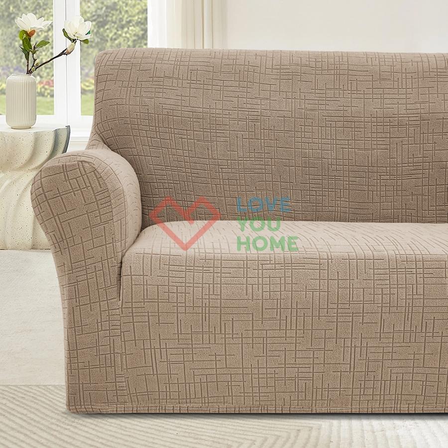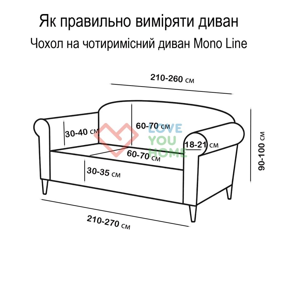 Еластичний трикотажний чохол із жакардовою текстурою для диванів Чохол виготовлений з якісного трикотажного матеріалу з жакардовою текстурою, яка надає інтер'єру сучасності та витонченості. Завдяки спеціальним виточкам і комплекту з поролоновими валиками, чохол забезпечує ідеальне прилягання до меблів, повторюючи форму сидіння, спинки і підлокітників. Основні характеристики: Матеріал: Високоякісний стрейчевий трикотаж із жакардовою текстурою, який поєднує еластичність і міцність. Дизайн: Однотонний і сучасний, гармонійно впишеться в будь-який інтер'єр. Комплектація: У набір входять поролонові валики для надійної фіксації тканини між сидінням, спинкою і підлокітниками. Функціональність: Ефективно захищає меблі від пилу, плям, пошкоджень і зносу. Переваги: Легке встановлення: Завдяки еластичній тканині та поролоновим валикам чохол легко натягується і надійно фіксується. Охайний вигляд: Ідеально прилягає до форми дивана, запобігаючи зміщенню. Простота догляду: Підходить для машинного прання, зберігаючи свою текстуру і насиченість кольору навіть після багаторазового використання. Вибір розміру: Двомісний диван: Оптимальний для меблів стандартного розміру з двома посадочними місцями. Тримісний диван: Розроблено для великих диванів із трьома посадочними місцями. Чотиримісний диван: Ідеально підходить для просторих диванів з чотирма посадочними місцями.
