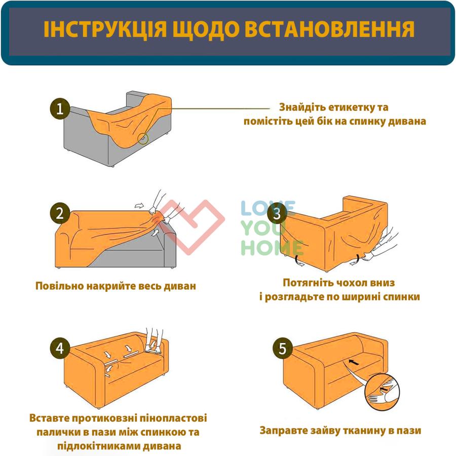 Еластичний трикотажний чохол із жакардовою текстурою для диванів Чохол виготовлений з якісного трикотажного матеріалу з жакардовою текстурою, яка надає інтер'єру сучасності та витонченості. Завдяки спеціальним виточкам і комплекту з поролоновими валиками, чохол забезпечує ідеальне прилягання до меблів, повторюючи форму сидіння, спинки і підлокітників. Основні характеристики: Матеріал: Високоякісний стрейчевий трикотаж із жакардовою текстурою, який поєднує еластичність і міцність. Дизайн: Однотонний і сучасний, гармонійно впишеться в будь-який інтер'єр. Комплектація: У набір входять поролонові валики для надійної фіксації тканини між сидінням, спинкою і підлокітниками. Функціональність: Ефективно захищає меблі від пилу, плям, пошкоджень і зносу. Переваги: Легке встановлення: Завдяки еластичній тканині та поролоновим валикам чохол легко натягується і надійно фіксується. Охайний вигляд: Ідеально прилягає до форми дивана, запобігаючи зміщенню. Простота догляду: Підходить для машинного прання, зберігаючи свою текстуру і насиченість кольору навіть після багаторазового використання. Вибір розміру: Двомісний диван: Оптимальний для меблів стандартного розміру з двома посадочними місцями. Тримісний диван: Розроблено для великих диванів із трьома посадочними місцями. Чотиримісний диван: Ідеально підходить для просторих диванів з чотирма посадочними місцями.