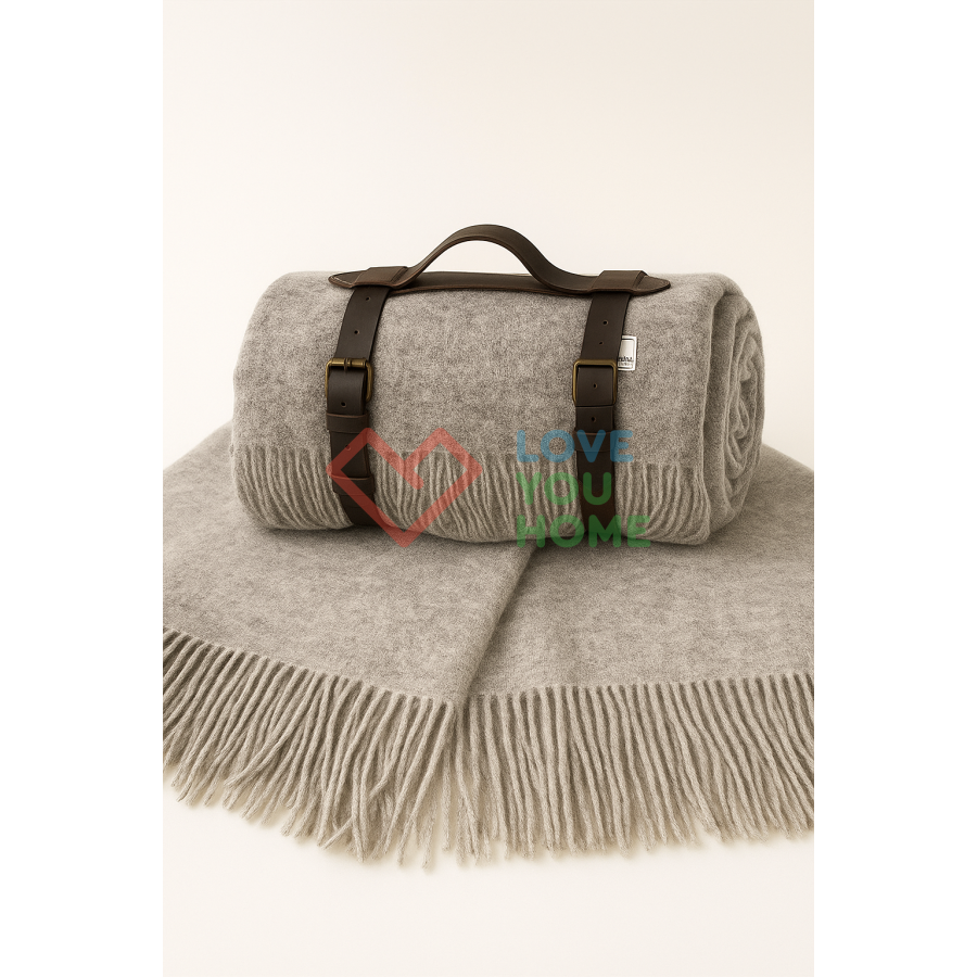 Плед тревел, 100% вовна (140×200 см). Натуральна вовна створює приємне відчуття тепла, добре утримує тепло та забезпечує комфортний відпочинок. Плед комплектується стильним і зручним шкіряним ременем, завдяки якому його легко брати з собою в подорож, на пікнік чи в офіс, а вдома він стає елегантним акцентом інтер’єру. Такий плед є чудовим подарунком для тих, хто цінує затишок, натуральні матеріали та лаконічний стиль.