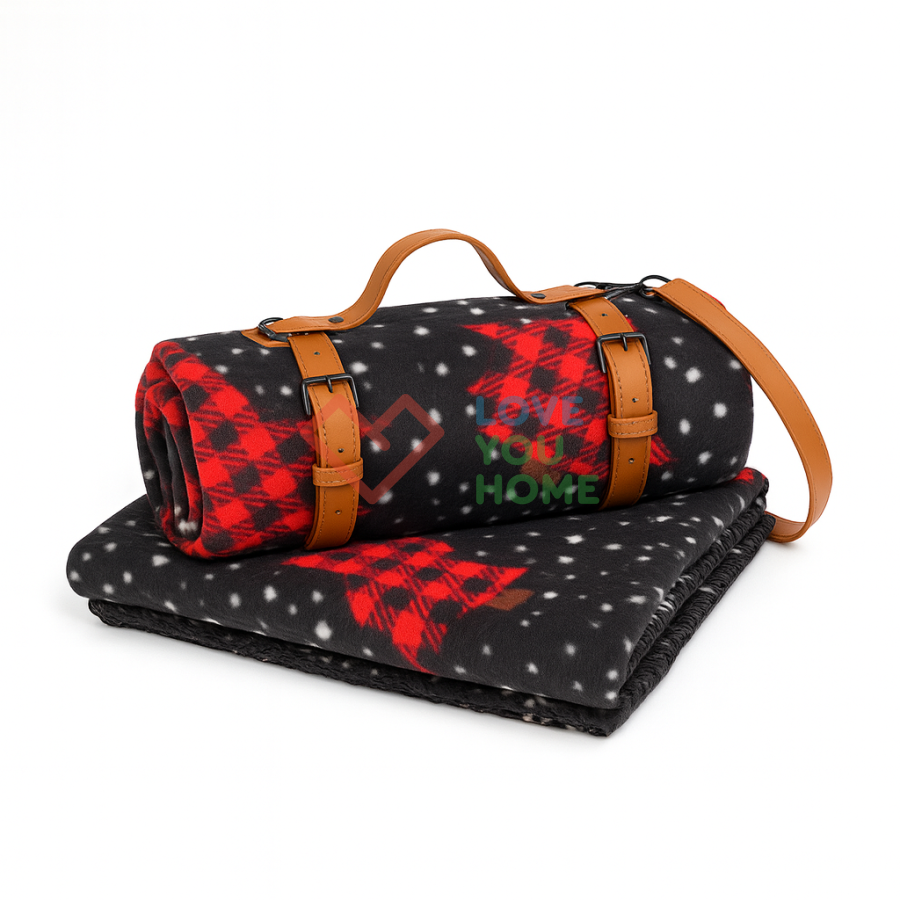 Плед тревел легкий флісовий Святкові ялинки 150x200 см з ременем Love You