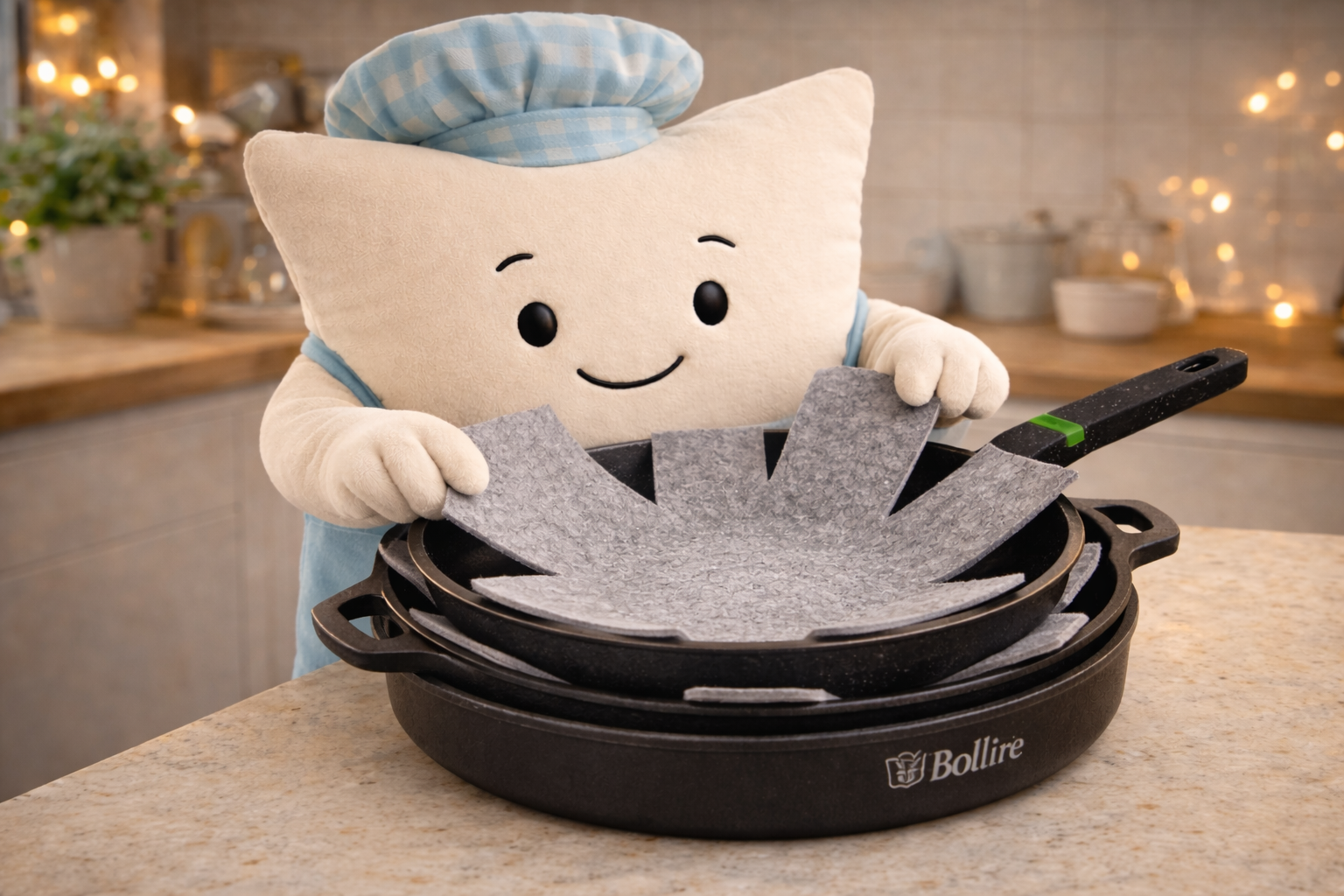 3. Умное хранение: Трюк с протектором Чаще всего сковородки царапаются не во время готовки, а при хранении «пирамидкой».