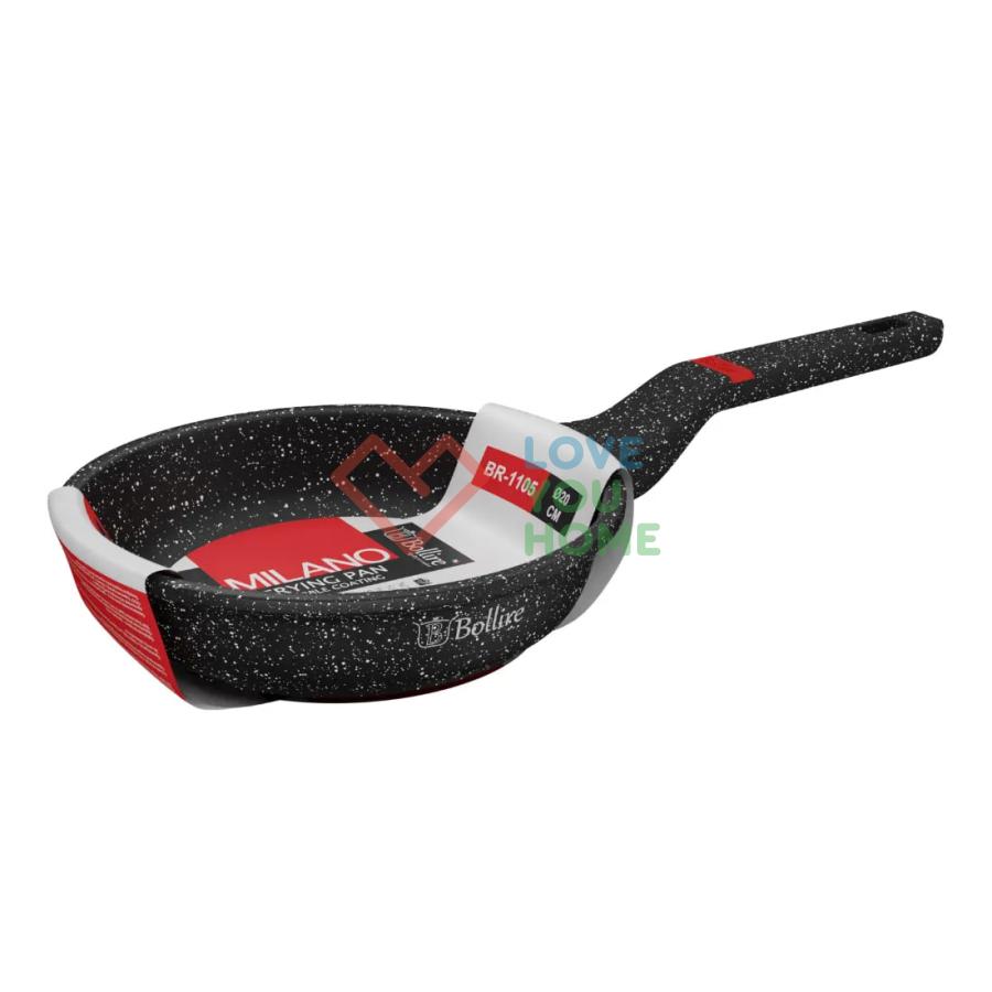Сковорода Bollire MILANO виготовлена з литого алюмінію. Внутрішня поверхня - з тришаровим зносостійким антипригарним покриттям Pfluon Marble, розрахованим на інтенсивне використання. Зовнішнє покриття - двошарове антипригарне Pfluon Marble, що полегшує догляд за посудом. Дно стовщене, індукційне, рівномірно розподіляє тепло. Ручка з бакеліту з покриттям Soft Touch та силіконовою вставкою - не нагрівається, приємна на дотик. Сковорода підходить для всіх типів плит, включаючи індукційні. Можна мити в посудомийній машині.
